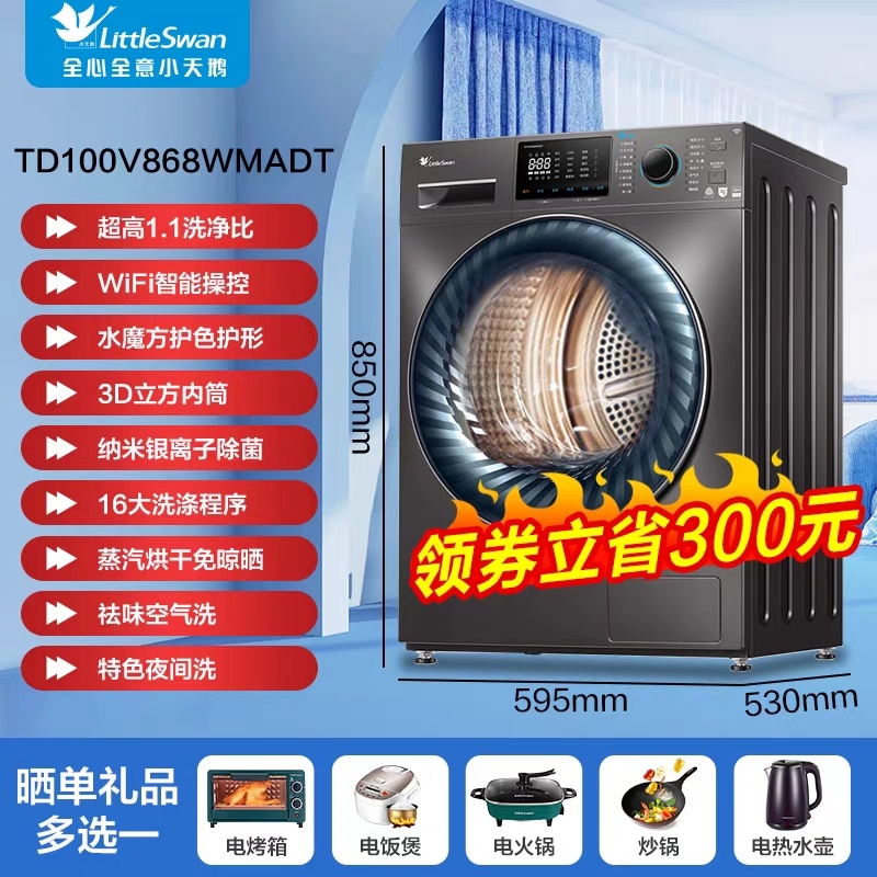 TD100V868WMADT,10kg大容量,黑色款,淘宝原价2800+买的,成色很好,功能都正常,WiFi智能操控,蒸汽烘干免晾晒、3D内筒、纳米银离子除菌,洗衣很干净,操作简单,适合家庭自用、出租房用。