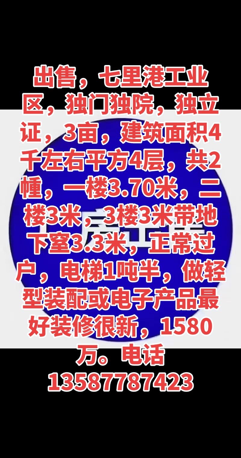 出售,七里港工业区,独门独院,独立证,3亩,建筑面积4千左右平方4层,共2,一楼3.70米,二楼3米,3楼3米带地下窒3.3米,正常过户,电梯1吨半,做轻型装配或电子产品最好装修很新,1580万。电话13587787423