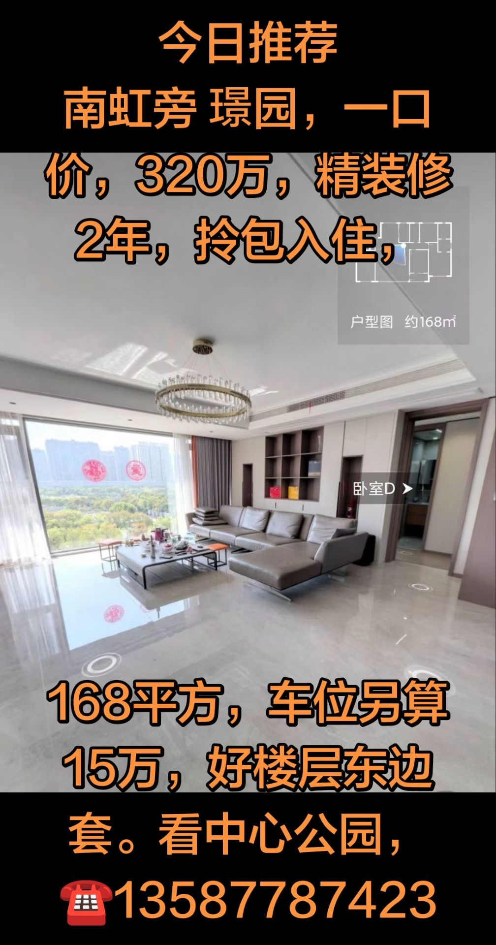 南虹旁 璟园,一口价,320万,精装修2年,拎包入住,168平方,车位另算15万,好楼层东边套。看中心公园,13587787423
