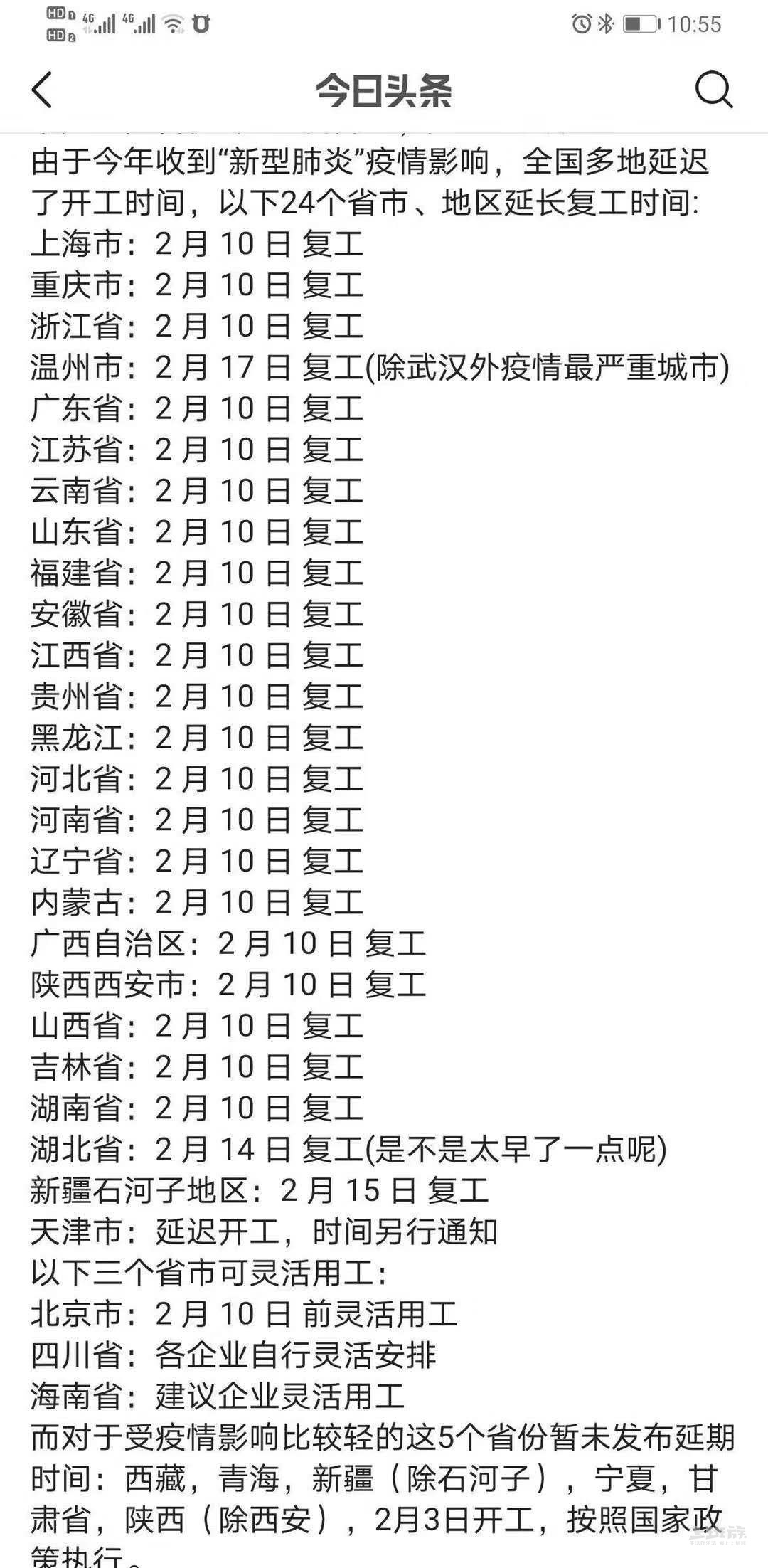 盐盘工业区,要我17号复工。厂里安排吃住,隔离在厂里上班,就担心一起有复工的人在潜伏期。