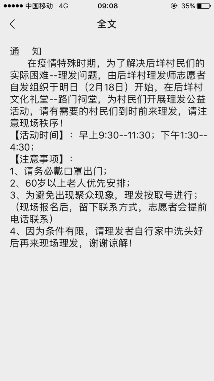 在疫情特殊时期,为解决后垟村民们的实际困难--理发问题,由后垟村理发师志愿者组织于明日(2月18日)开始,在后垟村文化礼堂--路门祠堂,为村民们开展理发公益活动,请有需要的村民们到时前来理发,请注意现场秩序!