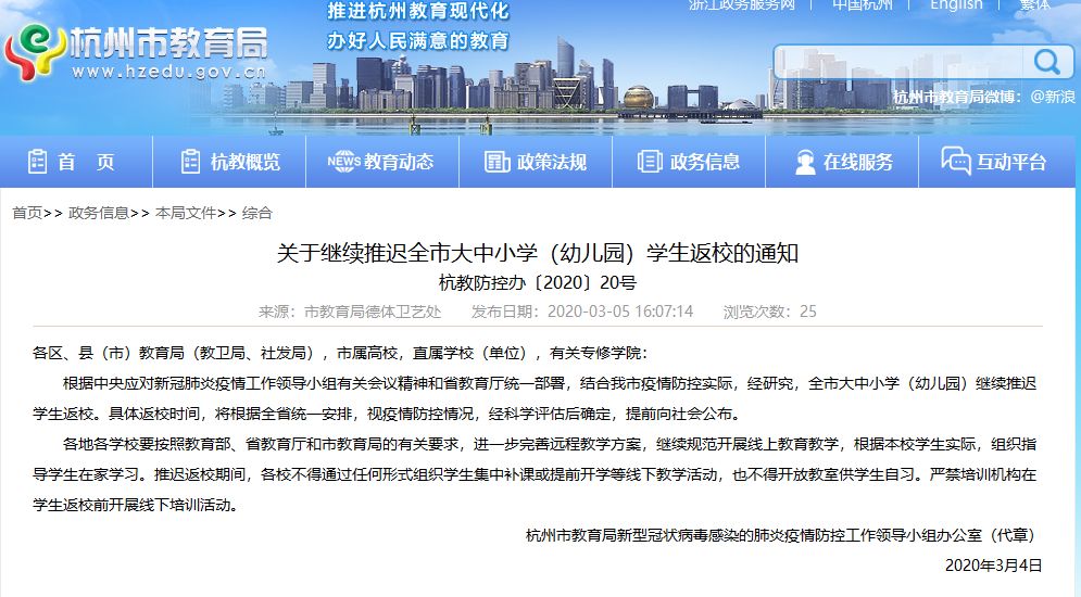3月5日,杭州市教育局官网发布《关于继续推迟全市大中小学(幼儿园)学生返校的通知》,具体如下↓