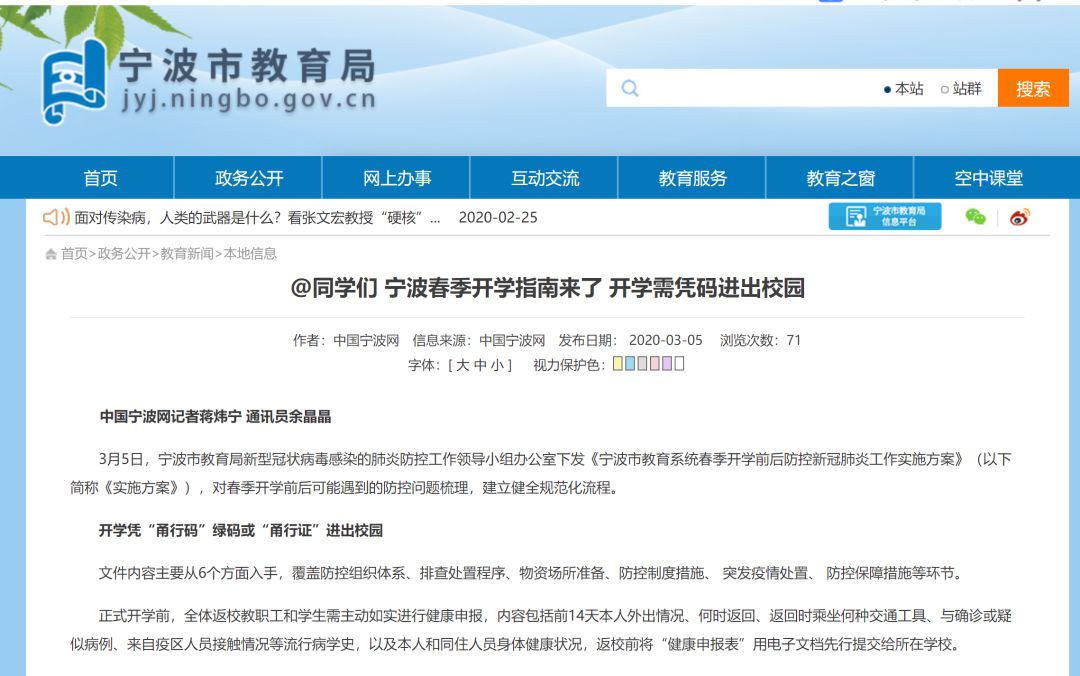 3月5日,宁波市教育局新型冠状病毒感染的肺炎防控工作领导小组办公室下发《宁波市教育系统春季开学前后防控新冠肺炎工作实施方案》(以下简称《实施方案》),事无巨细对春季开学前后可能遇到的防控问题进行总结梳理,并建立健全规范化流程。