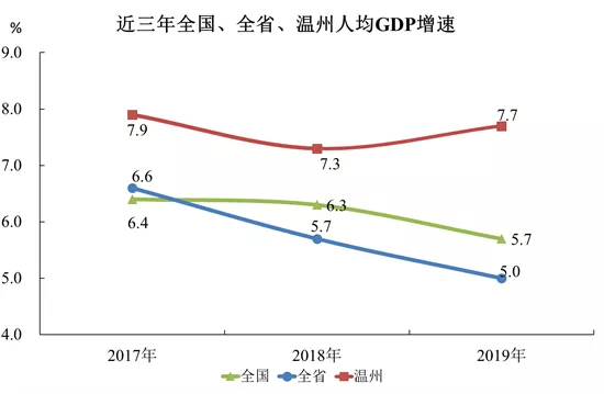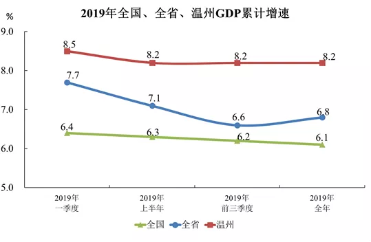 温州经济站上新高度。温州市统计局新发布数据显示,据浙江省统计局核算,2019年,温州实现地区生产总值(GDP)6606.1亿元,按可比价计算,同比增长8.2%,总量和增速均居全省第3位。”