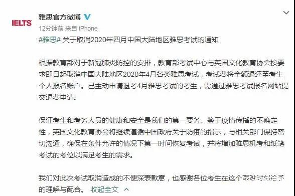 据雅思官方微博通报:根据教育部对于新冠肺炎防控的安排,教育部考试中心与英国文化教育协会按要求即日起取消中国大陆地区2020年4月各类雅思考试,考试费将全额退还至考生个人报名账户。已主动申请退考4月雅思考试的考生,需通过雅思考试报名网站提交退费申请。