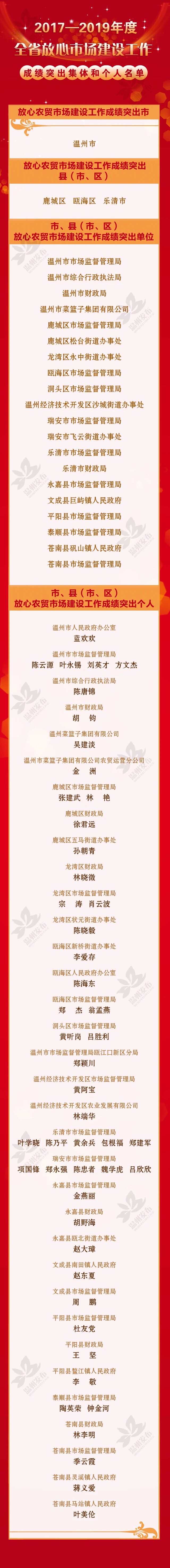 据了解,在此次表彰中,温州市市场监督管理局等20家单位获评“市、县(市、区)放心农贸市场建设工作成绩突出单位”;蓝欢欢(温州市人民政府办公室)等50位同志获评市、县(市、区)放心农贸市场建设工作成绩突出个人。