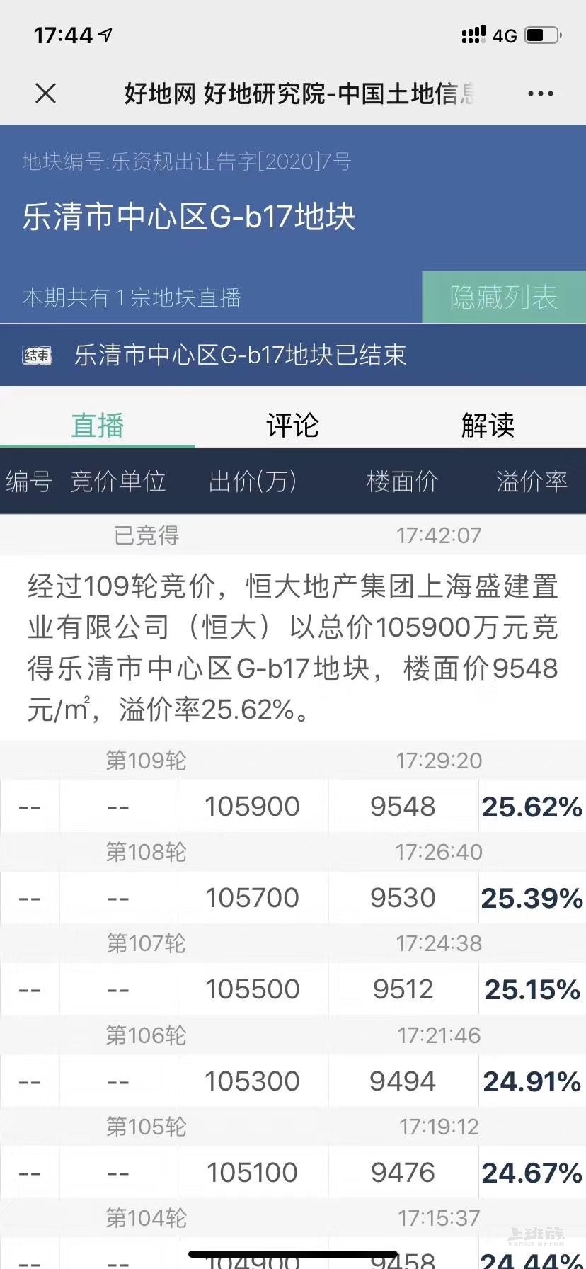 2019年9月26日,乐清市中心区G-b17地块由乐清市国有投资有限公司竞得,成交价9亿元,成交楼面价8114元/㎡,溢价率0%。