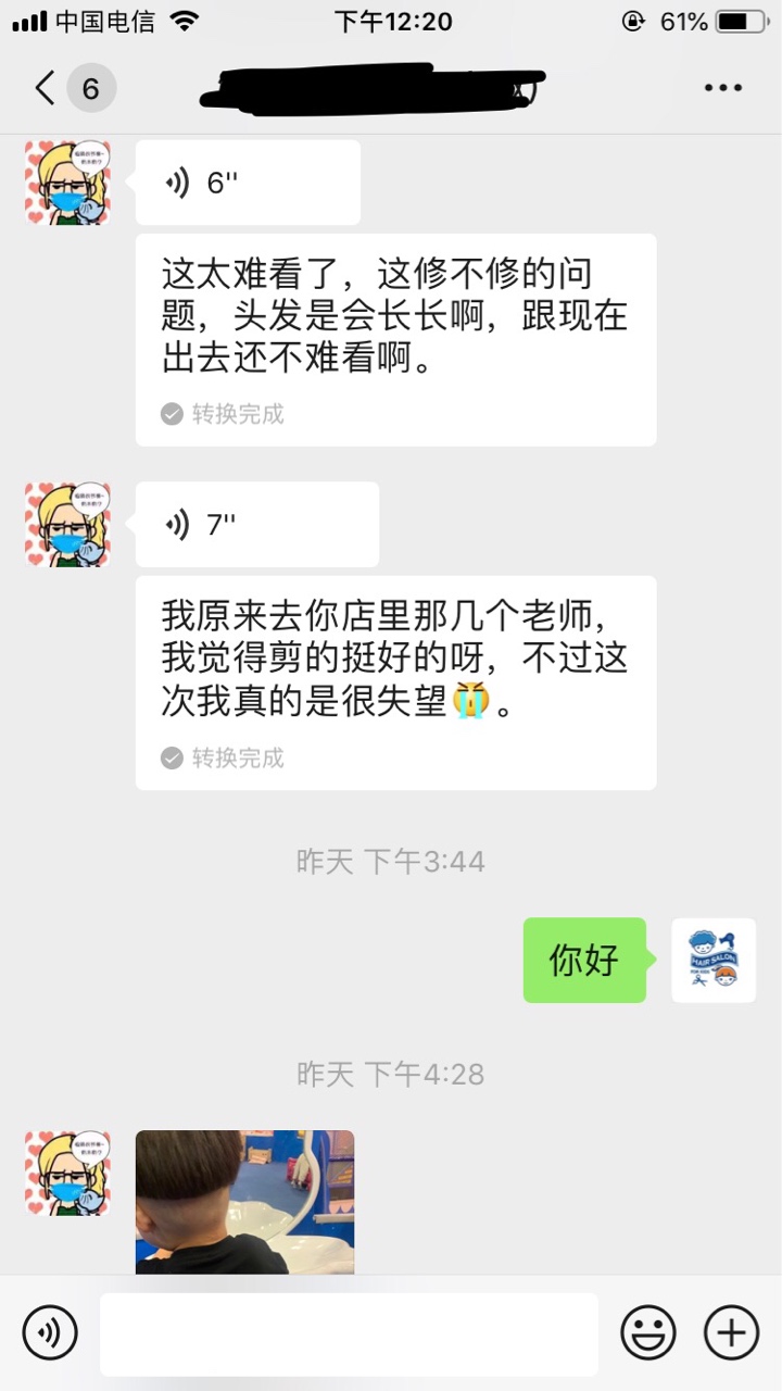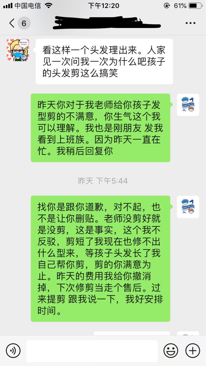 哪个孩子不是父母的心头肉,我们相信你们会专业,结果你们干这样的事情!搞的跟狗啃的一样!我就想不通你凭什么让一个这么不专业的新手去给我女儿剪头发,女孩子剪这种一刀的头,我拿个脸盆扣住也能剪啊,女孩子啊,你就这样剪不难看吗?你要练手你拿假人去练啊!我是钱少给你了?还是你们就欺负孩子她妈妈一个人过去?童心的老板你记住你这样生意做不长的!