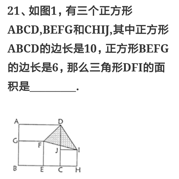 20, 阴影面积和正方形CHIJ大小无关,把直接把正方形CHIJJ集中到一个点C上,直接是求三角形CDF的面积 显然是10*4/2=20