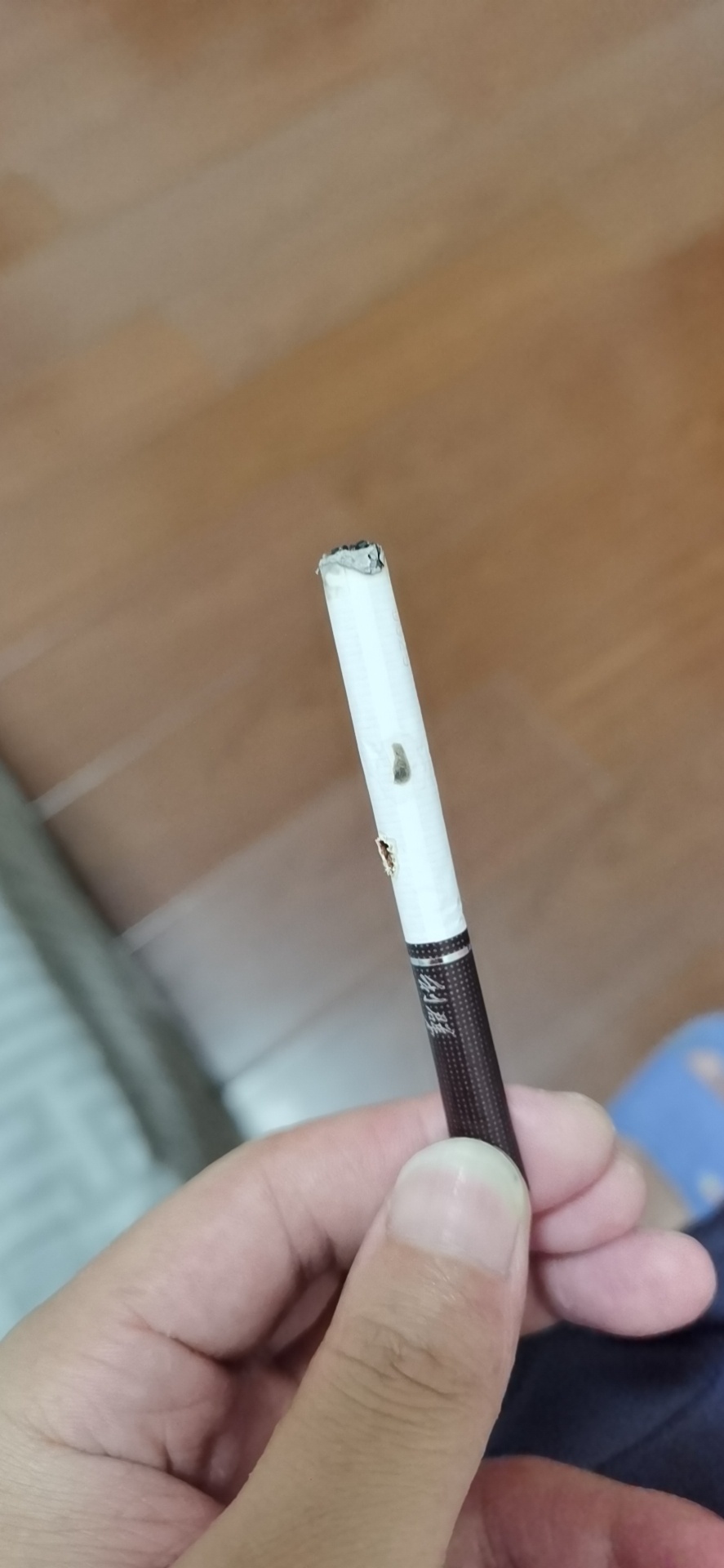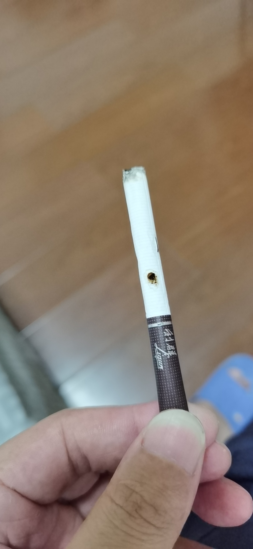 第一次碰到这种事情,刚从烟盒里拿出来的,点了两次没点着觉得奇怪仔细一看烟上面有个洞...买过来之后一直兜里揣着,仔细检查烟盒没洞...