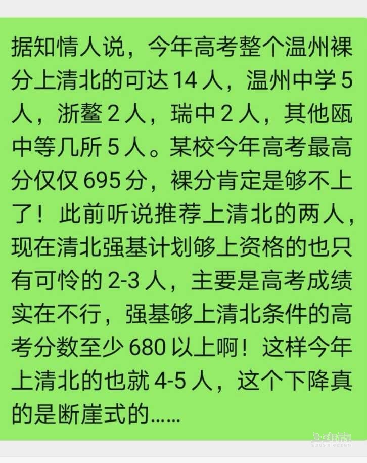 清北强基招生政策是先符合一定条件才能进强基选拔,进入强基后高考分数还得需要很高分才能进清北。比如今年浙江省通过强基进清华北大的最低分接近680,文科医学还超680,中国人民大学最低680。这样对高中学校来说要求更高了,乐清高中要及时调整对策,否则就算进了强基高考分数不够也没用。