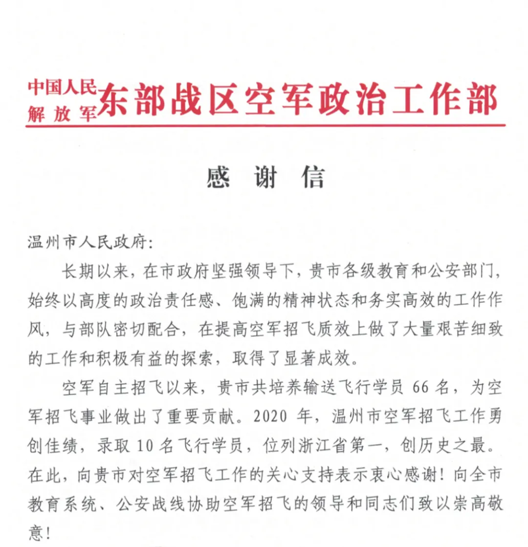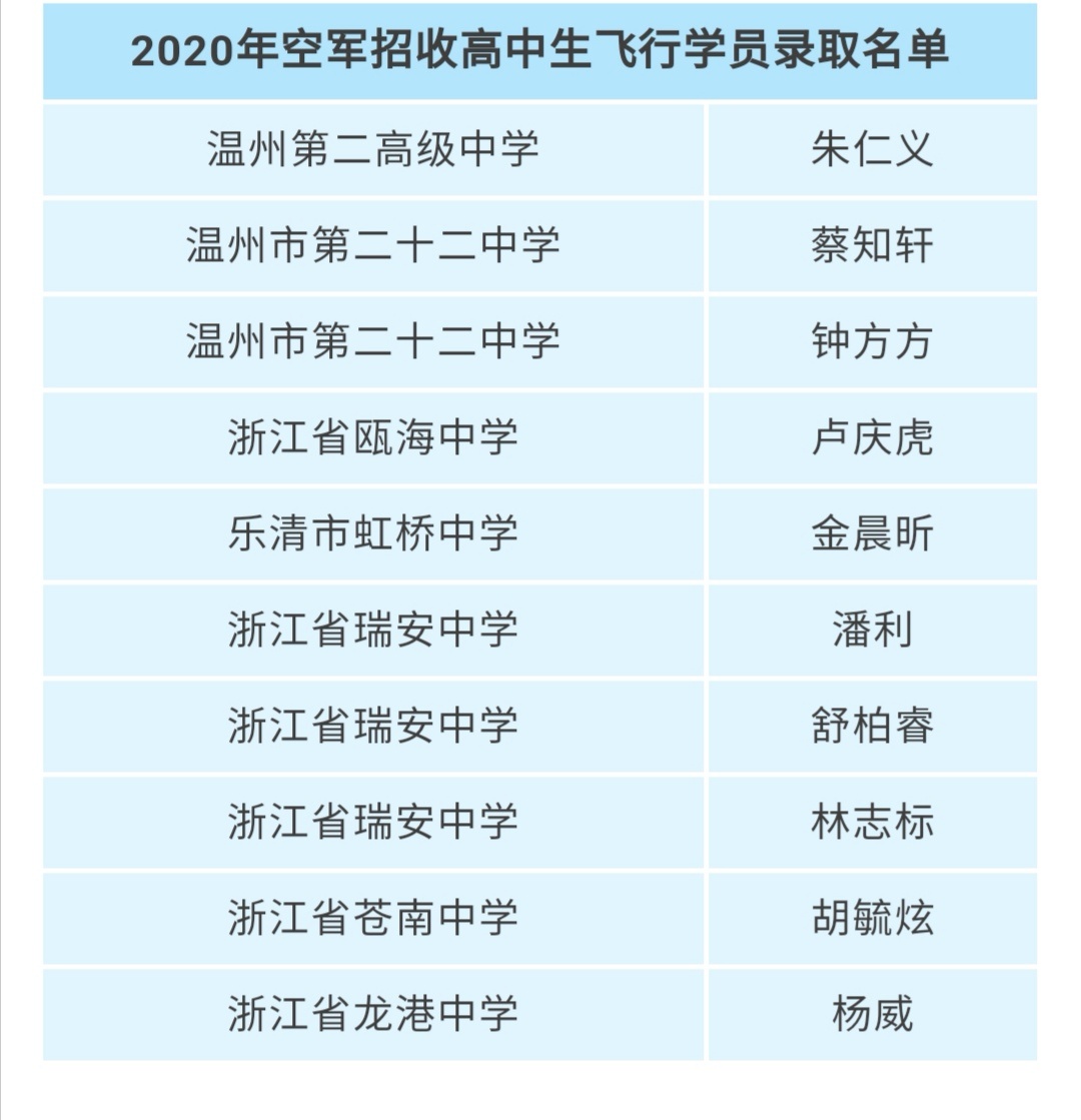 2020年温州市空军飞行学员录取10人!创历史新高!居全省第一!我市虹桥中学榜上有名。