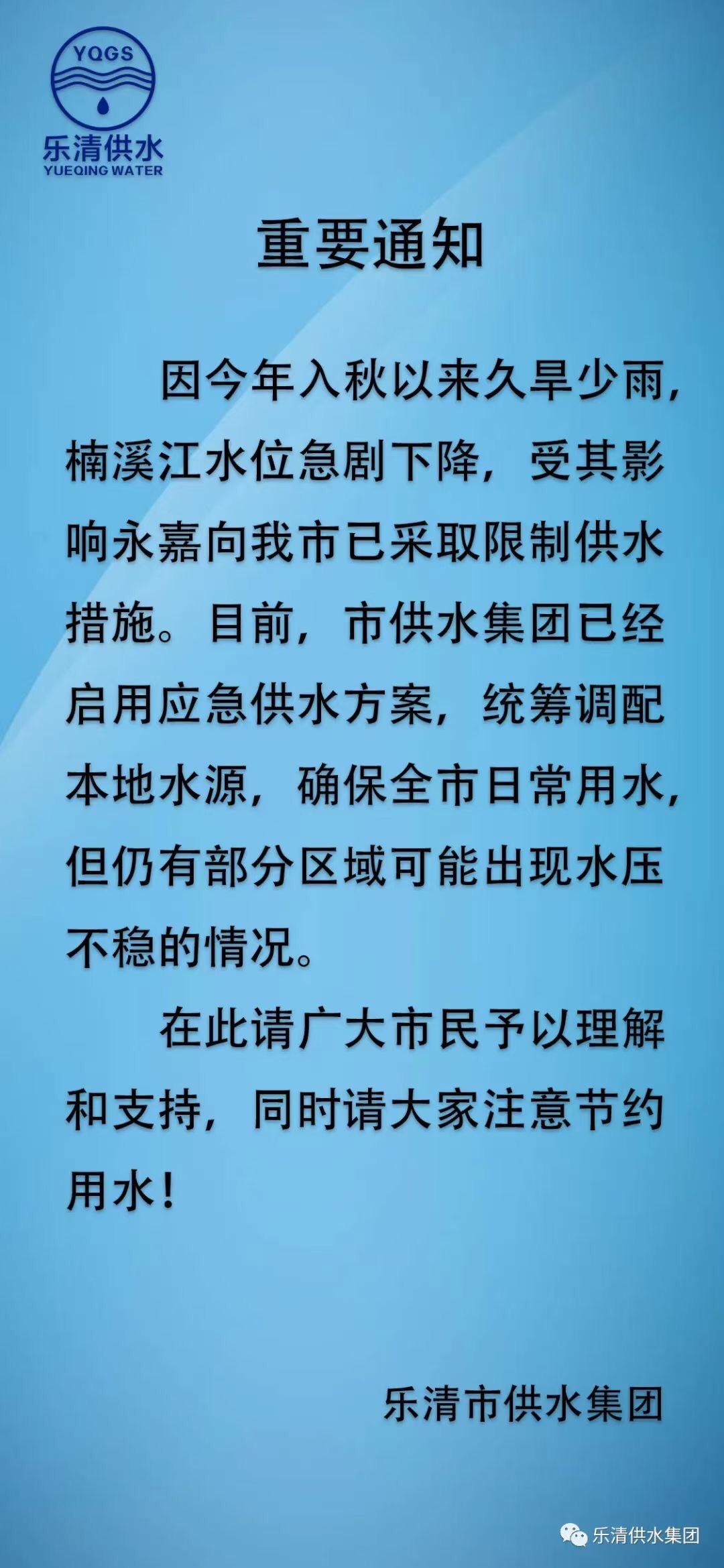 楠溪江引水工程那边,之前永嘉一天给乐清市20W吨,现在减少到一天10W吨,水有点不够用了