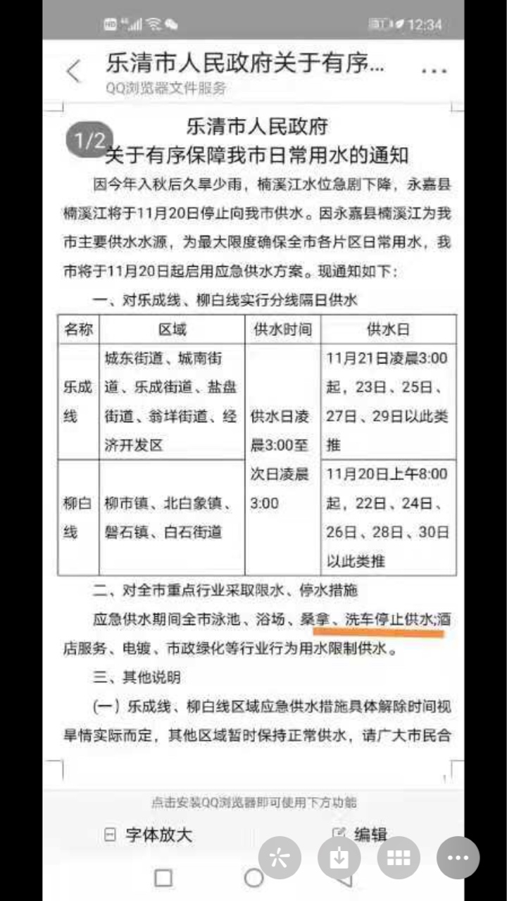 今年下半年以来,已经有几个月没下雨了,如今天天阳光普照,犹如夏季,用水量不降反增了,现在乐清水源告急,市政府决定限制供水了,大家在做好节约用水的同时一定要做好储水准备。