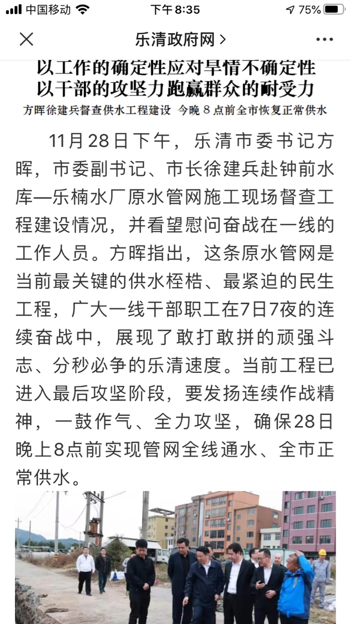 用户您好,市供水集团已于7点半完成工程,管道开始试通水,乐楠水厂恢复生产。由于是一个系统性的水量和压力调配工程,全市各个片区恢复正常供水时间要视具体情况。目前各片区水压正在逐步恢复,敬请谅解!