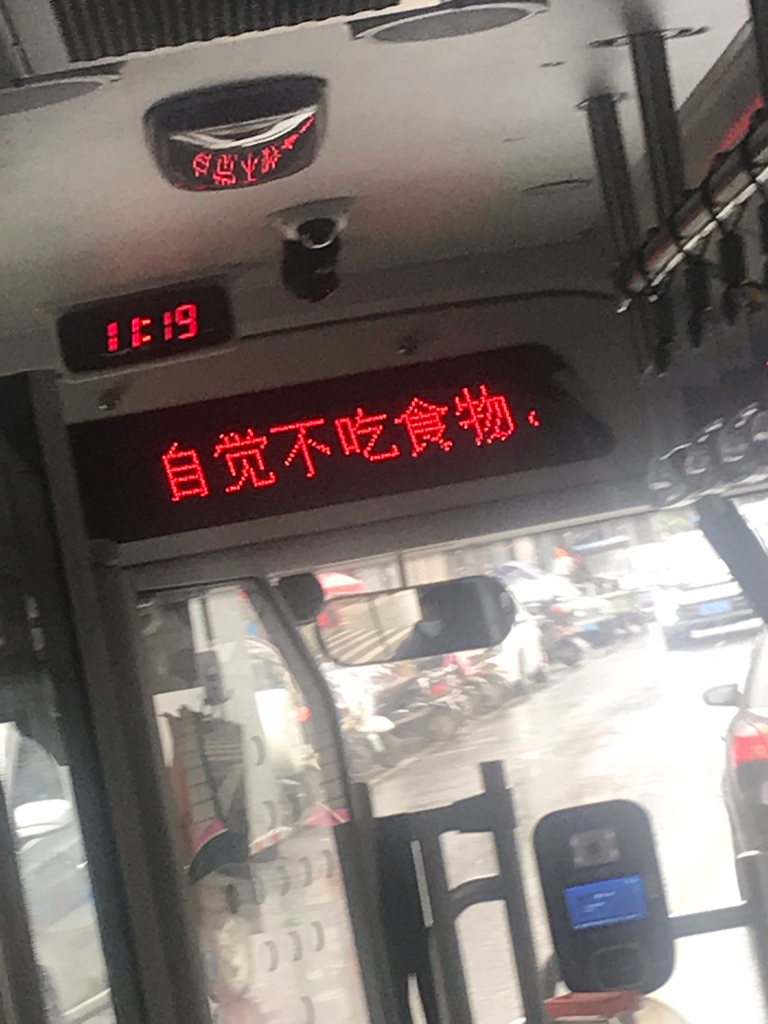 我在温州坐公交的时候 饿了就吃几口 车里马上就响起乘公交禁止吃东西的声音