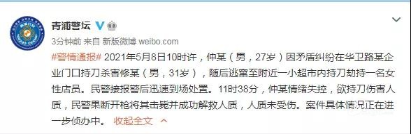 男子因矛盾纠纷杀害他人后持刀劫持一名人质,上海警方通报:开枪将其击毙并成功解救人质 5月8日下午,上海市公安局青浦分局官方微博@青浦警坛 发布关于“一男子因矛盾纠纷杀害他人后持刀劫持一人质”案情通报,全 ...
