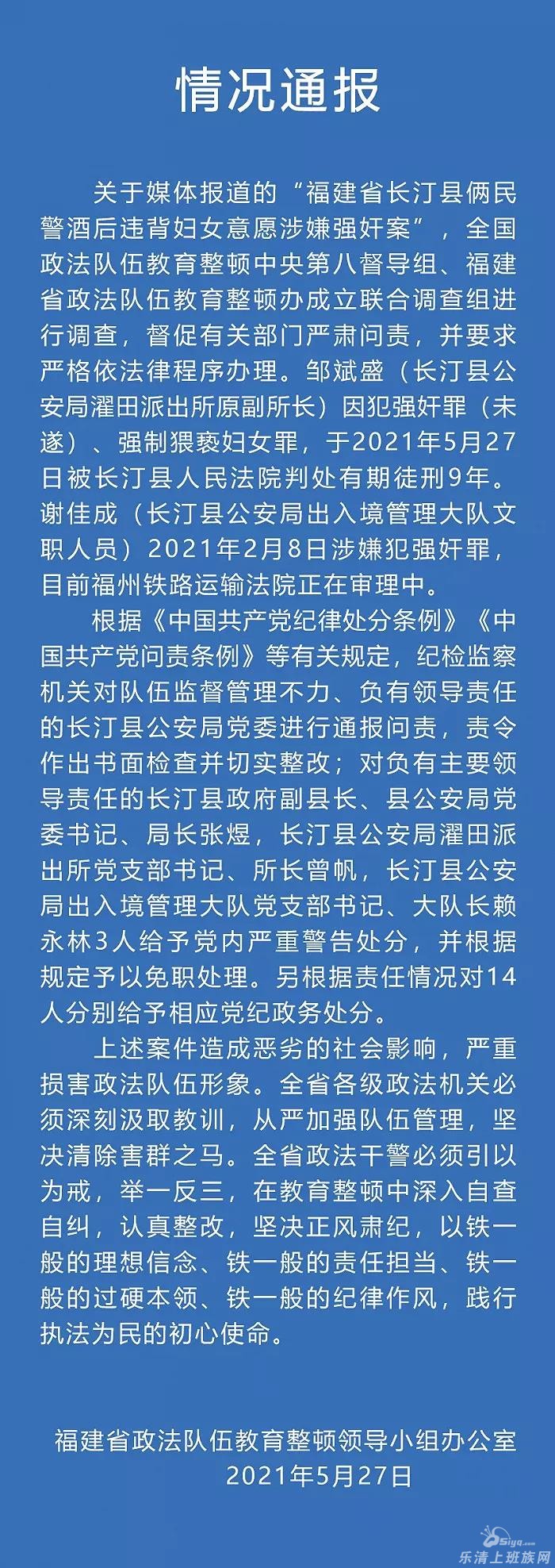 5月27日消息▼ 关于媒体报道的“福建省长汀县俩民警酒后违背妇女意愿涉嫌强奸案”,全国政法队伍教育整顿中央第八督导组、福建省政法队伍教育整顿办成立联合调查组进行调查,督促有关部门严肃问责,并要求严格依法 ...