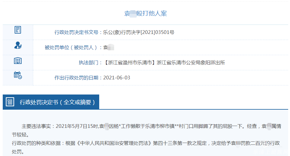 主要违法事实:2021年5月7日15时,袁*因杨*工作懒散于乐清市柳市镇**村门口用脚踢了其的屁股一下。经查,袁*属情节较轻。 行政处罚的种类和依据:根据《中华人民共和国治安管理处罚法 ...