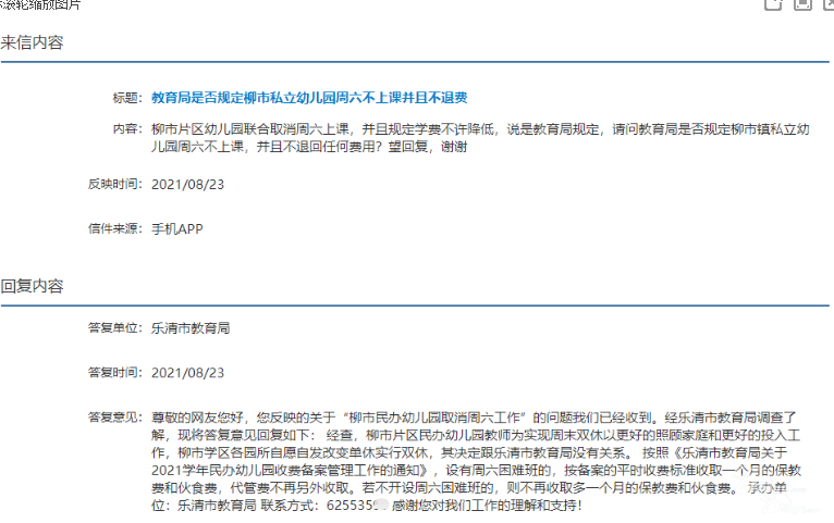 | 实行双减,好了,幼儿园星期六也不上了,那么学费这么贵能不能退点,一个孩子感冒发烧请假3-5天,一个学期反反复复,加上取消周六,学费又不退,是不是给家长们也搞个带薪双休日,柳市基本都是私立幼儿园,都是他们说了算,听说所有私立幼儿园都签了协议,周六不上不退费,都当家长是二,家长有苦跟谁说去,还三胎,二胎都带不起了 |