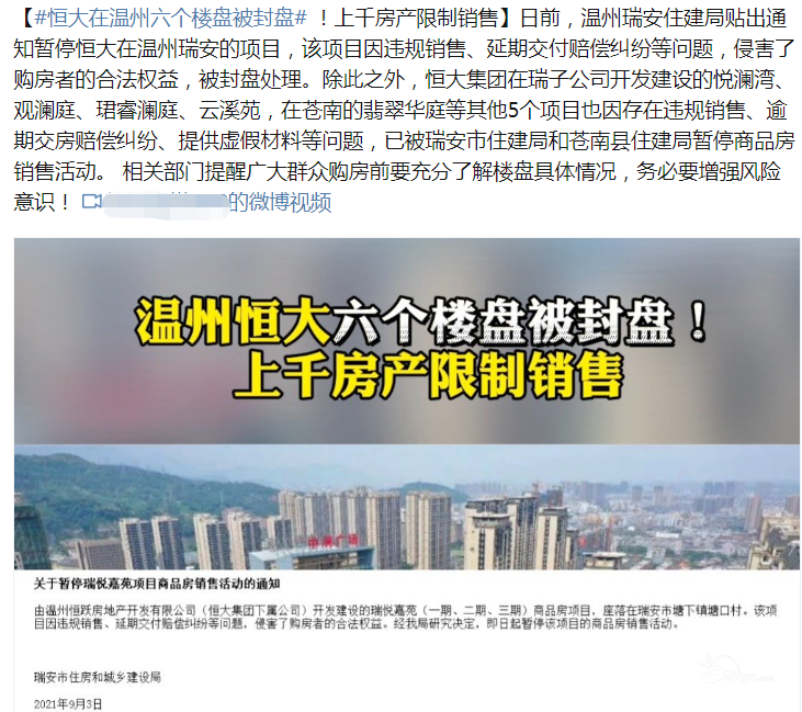 恒大在温州六个楼盘被封盘!瑞安和苍南的几个被封盘了,这么突然?!乐清恒大的盘会不会有影响啊?