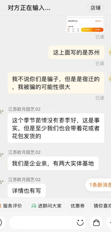 标的是苏州发货,结果是沐阳发出来的,宿迁地区,也包括沐阳,然后我要求退款,结果对方不同意,还出口成脏, 只要你在网上买花,必然会遇到宿迁地区的,你没被宿迁人的花苗骗过,你就不算在养花这个大学毕业. 买了 ...