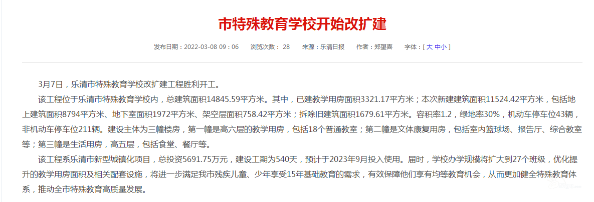 本帖最后由 瘦丢丢 于 2022-3-8 14:08 编辑 3月7日,乐清市特殊教育学校改扩建工程胜利开工。 该工程位于乐清市特殊教育学校内,总建筑面积14845.59平方 ...