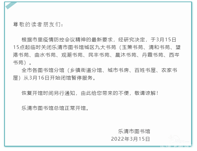 本帖最后由 乐清小痞子 于 2022-3-17 13:53 编辑 各地图书馆都关门了,只有总的还开着,大家不要跑空了