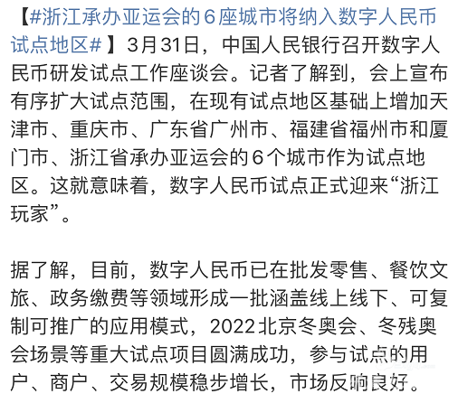 超赞!浙江承办亚运会的6座城市:杭州、宁波、温州、湖州、绍兴、金华,被纳入数字人民币试点地区啦!鼓掌鼓掌!