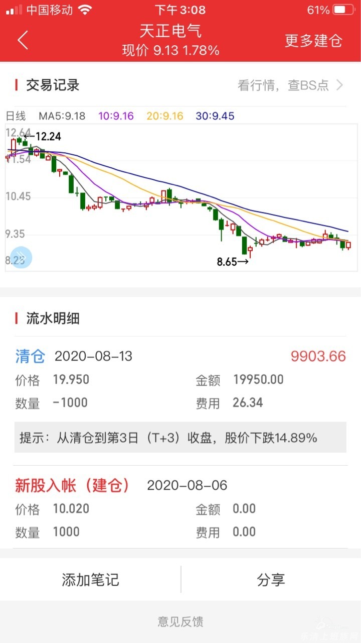 天正股票大跌 ? 买了天正的股票 一路下跌 丝毫没有止跌的迹象 天正是否出问题了! 相关热评: @老大地幸福:有人花钱就有人挣钱 @乐清阿兵:不好意思,天正挣了一点的飘过