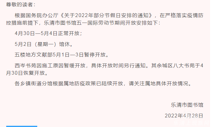本帖最后由 乐清小刺老 于 2022-4-29 10:53 编辑 乐清图书馆4月30日—5月4日正常开放;但5月2日(星期一)馆休。大家不要跑空了!
