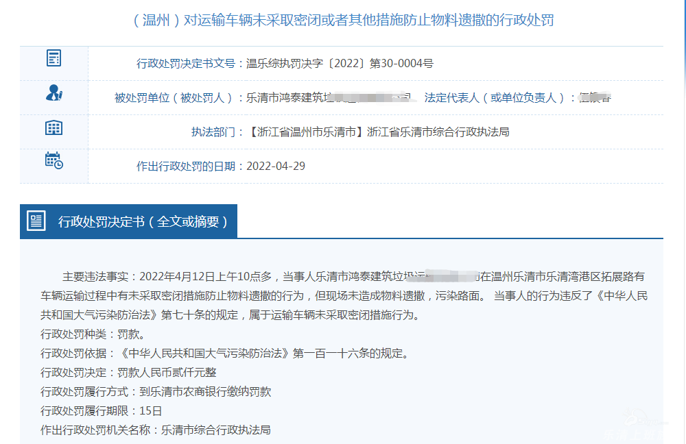 乐清一个建筑垃圾运输公司因未采取密闭措施防止物料遗撒的行为被罚了!咱还是说运输时一定要做好密闭措施!