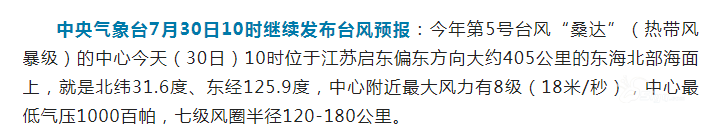 本帖最后由 九里明 于 2022-7-30 14:01 编辑 今天十点的时候中央气象台发布了台风预警!预计桑达逐渐向浙江东北部到江苏南部的沿海靠近...