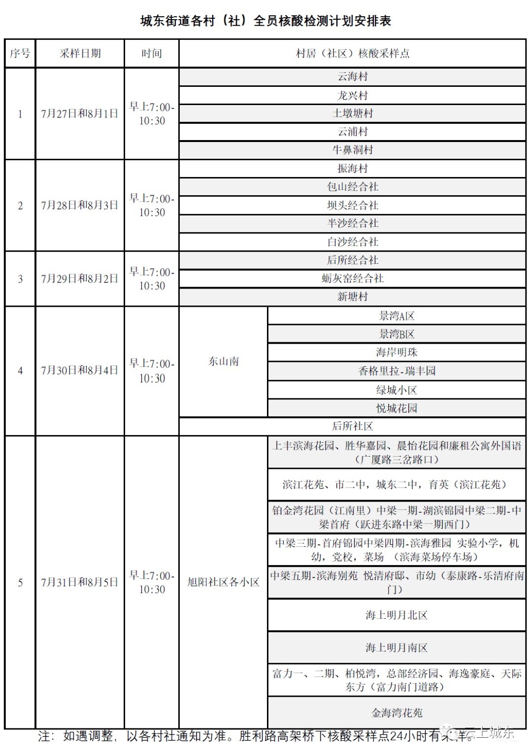 城东街道城东街道广大居民: 为进一步加强疫情防控工作,根据乐清市防控办工作要求,经街道党工委、办事处研究,决定于2022年7月27日至8月5日在辖区各村社临时核酸采样点开展区域(五天一轮)全员免费核酸检测。 ...