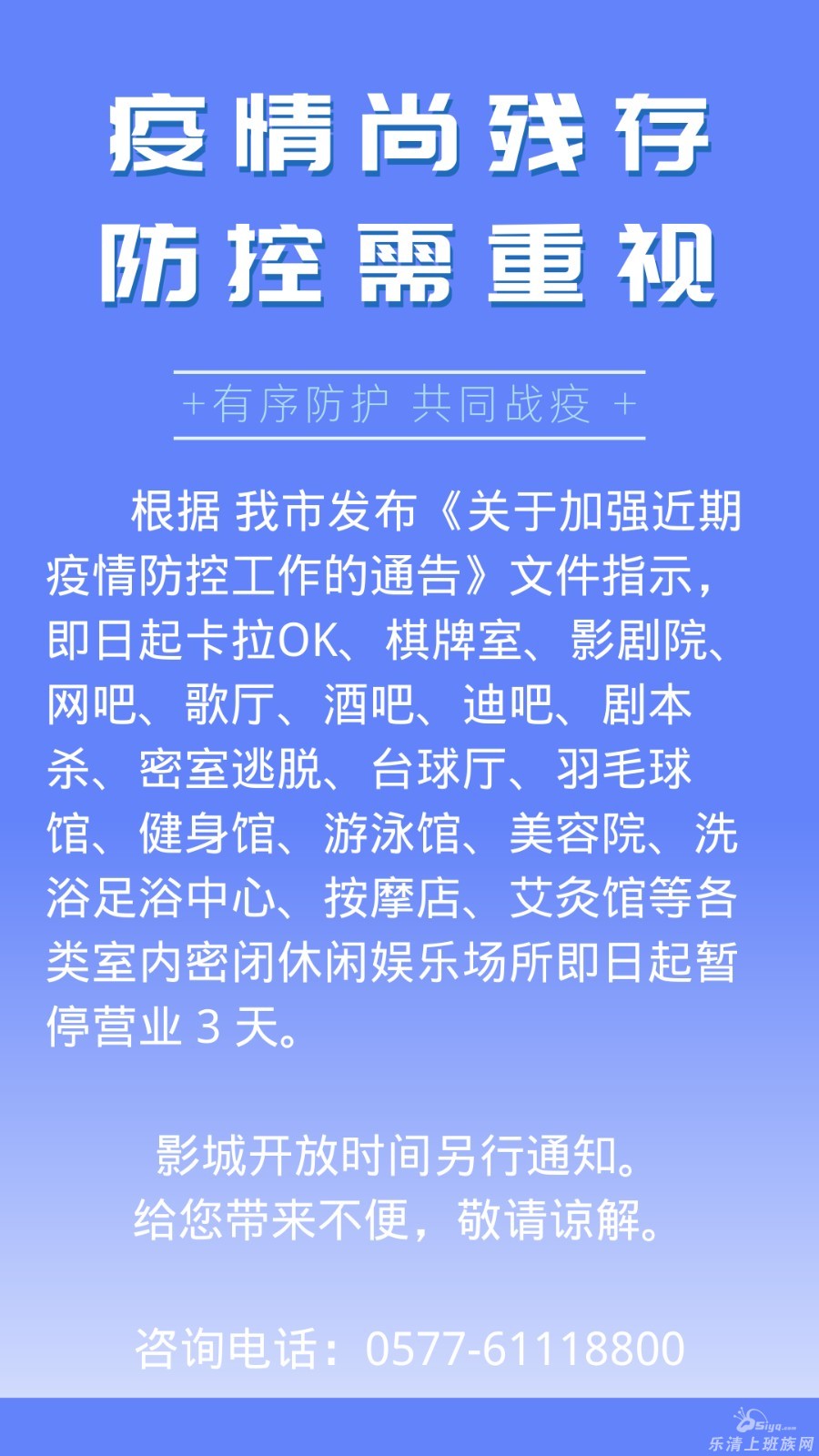 本帖最后由 感觉很棒 于 2022-8-16 20:50 编辑 乐清奥斯卡影城有限公司 【停业通知】因疫情防控需要,奥斯卡影城即日起暂停营业! 尊敬的影迷朋友: 为响应国家疫情防控政策,保障广大影迷的安 ...
