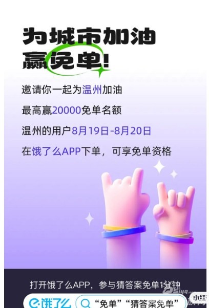 加油时间:8.17-8.18两天 免单时间:8.19-8.20两天 加油步骤: 打开饿了么APP首页输入免单,跳到城市专场,为温州点赞加油再顺手分享一个 能不能获得2万个免单机会,都靠大家加油了!!!冲冲冲!!! ...