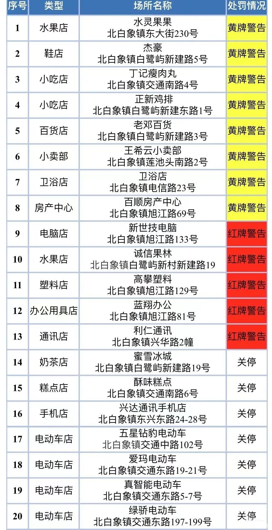 2022年8月18日,北白象镇对各类场所开展了疫情防控措施落实情况专项巡查,现将措施落实不到位的场所公示如下(黄牌警告8家,红牌警告5家,关停7家)。 2022年8月18日疫情防控措施落实不到位场所挂牌或关停清单 ...