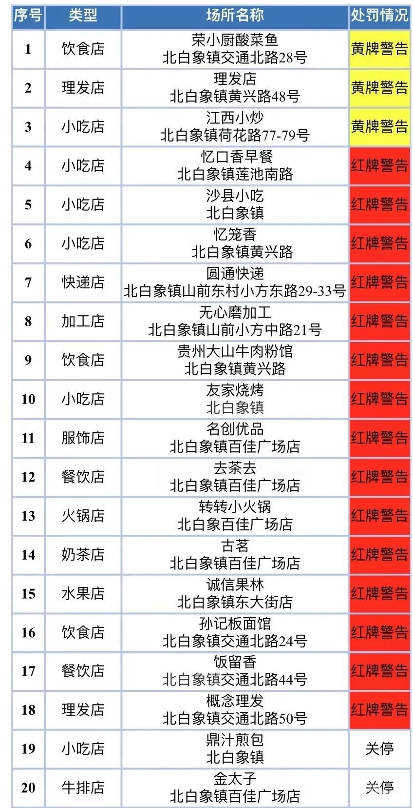 —————8月23日—————2022年8月22日,北白象镇对各类场所开展了疫情防控措施落实情况专项巡查,现将措施落实不到位的场所公示如下(黄牌警告5家,红牌警告10家)。 2022年8月22日疫情防控措施落实不到位场 ...