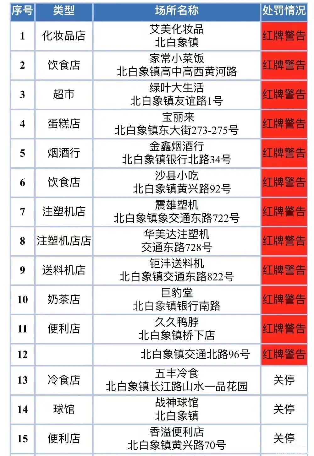 2022年8月23日,北白象镇对各类场所开展了疫情防控措施落实情况专项巡查,现将措施落实不到位的场所公示如下(红牌警告12家,关停3家)。 2022年8月23日疫情防控措施落实不到位场所挂牌或关停清单 ...