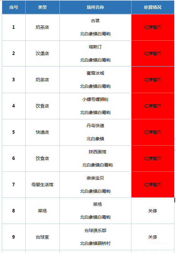 2022年9月13日,北白象镇对各类场所开展了疫情防控措施落实情况专项巡查,现将措施落实不到位的场所公示如下(红牌警告7家,关停2家)。 2022年9月13日疫情防控措施落实不到位场所挂牌或关停清单 ...