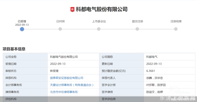 科都电气股份有限公司要上市募资6.37亿元 企业基本资料 深交所官网显示,创业板IPO获得受理,公司拟募资6.37亿元 来源:深交所、科都电气股份有限公司网站
