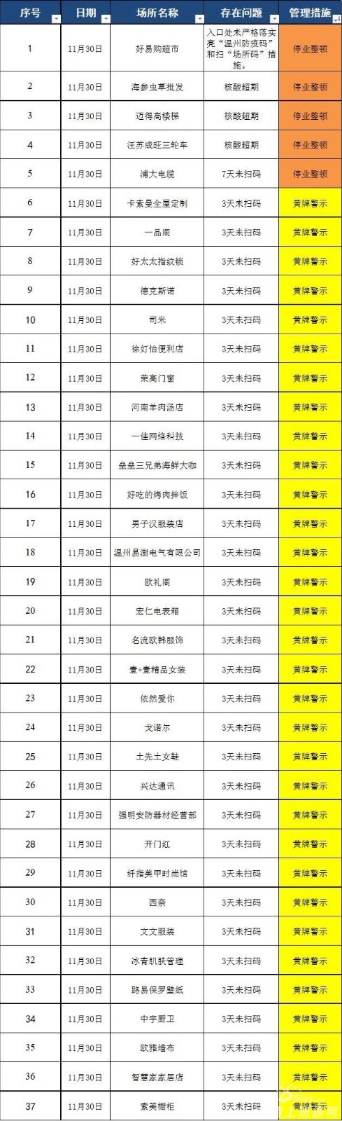 疫情防控 11月30日,柳市镇防疫办联合综合行政执法队对沿街店铺(场所)进行疫情防控检查。对5家店铺进行“停业整顿”,对32家3天以上未实行场所码扫码的店铺进行“黄牌警示”。 来源:今日柳市