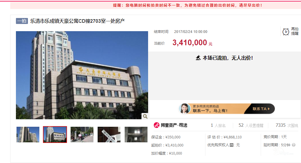 同样一套房子,乐清市城南街道天豪公寓CD幢2703室,2017年2月24日341万无人出价,3月17日陈某却以435万的价格拍卖到手,一直毛胚空置,2023年2月21日4914000无人竞拍,3月14日却以541.4万的价格成交。   ...