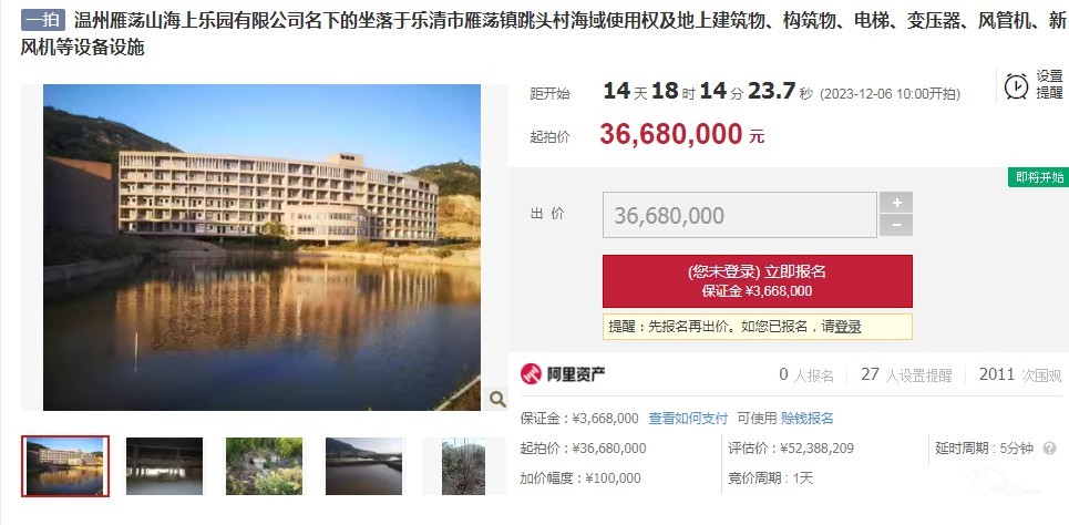 近日,温州雁荡山海上乐园有限公司名下的坐落于乐清市雁荡镇跳头村海域使用权及地上建筑物、构筑物、电梯、变压器、风管机、新风机等设备设施在阿里拍卖网上公开拍卖。 来源:阿里拍卖
