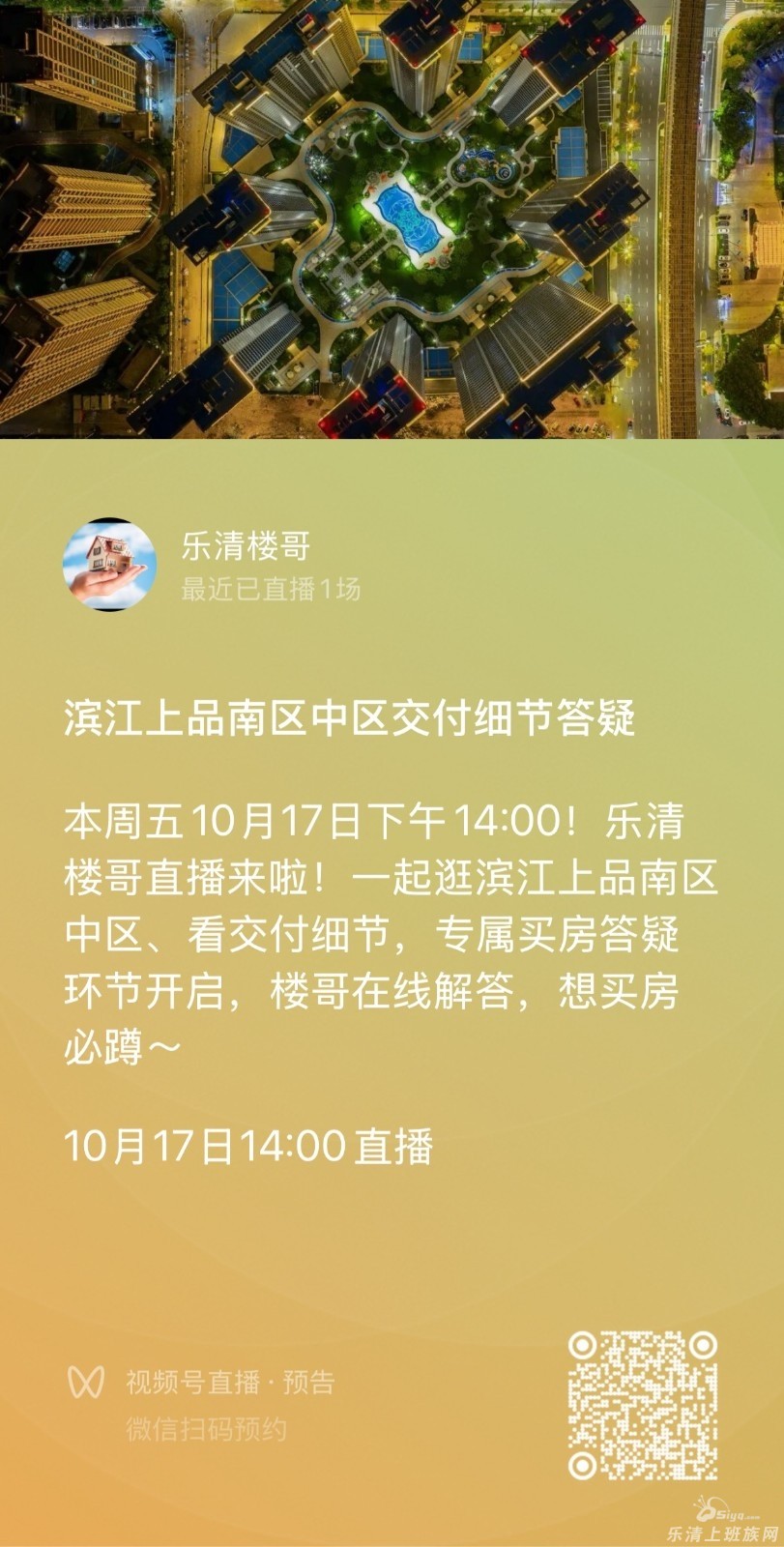 本周五 10 月 17 日下午 14:00,备受乐清购房者关注的 “乐清楼哥” 直播即将准时开启!直播地址关注乐清楼市微信公众号视频号或扫二维码即可进入。此次直播干货满满,楼哥将带领大家实地探访滨江上品的南区与中区 ...