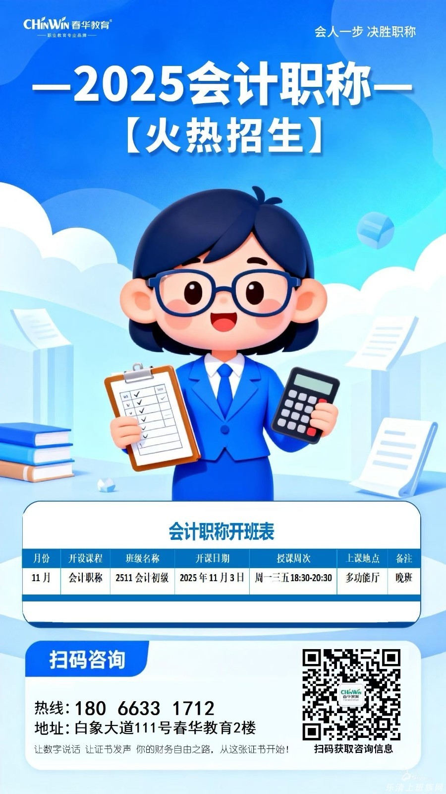 📣春华教育2025会计职称班火热招生中! 11月3日开课,周一三五晚班,零基础也能轻松上手! 📍地址:白象大道111号春华教育2楼 📱扫码咨询,赢在起点,决胜职称!