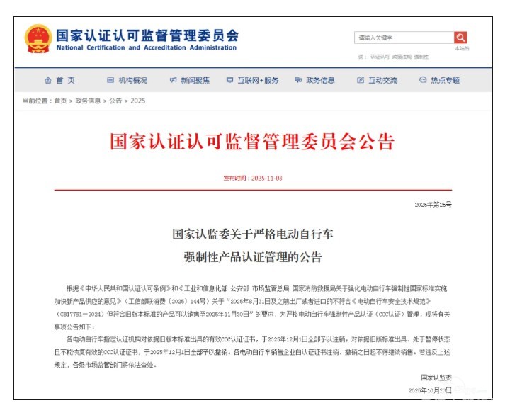 乐清骑电动车的注意了以后这种电动车不!能!买!近日,国家认监委发布《关于严格电动自行车强制性产品认证管理的公告》(2025年第25号),对电动自行车生产、销售作出明确规定。 这意味着12月1日以后旧国标车无 ...