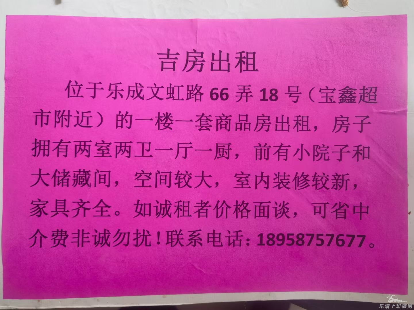 吉屋出租:自己家老房子,位置乐成街道文虹路66弄18号(北面横河南路37号),约80平方+坦道,可以拎包入住。二室一厅二卫一厨房一储间(适合一家人居住),租金包年优惠,有意可看房洽谈,联系号码18958757677(非诚 ...