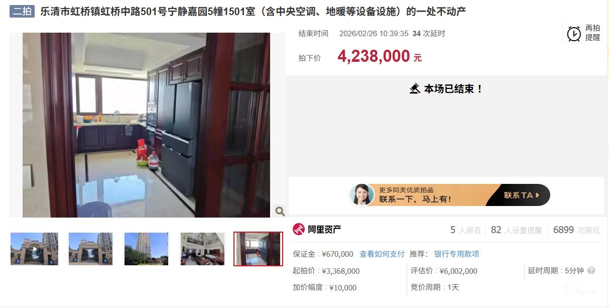 近日,阿里拍卖平台上,乐清虹桥镇热门小区宁静嘉园一套房产引发关注。该房源首次流拍后,二次拍卖反而热度飙升,遭到多人激烈争抢。 该房屋存在650 万元抵押,拍卖款将优先用于偿还债务,竞拍人需待法院解押后 ...