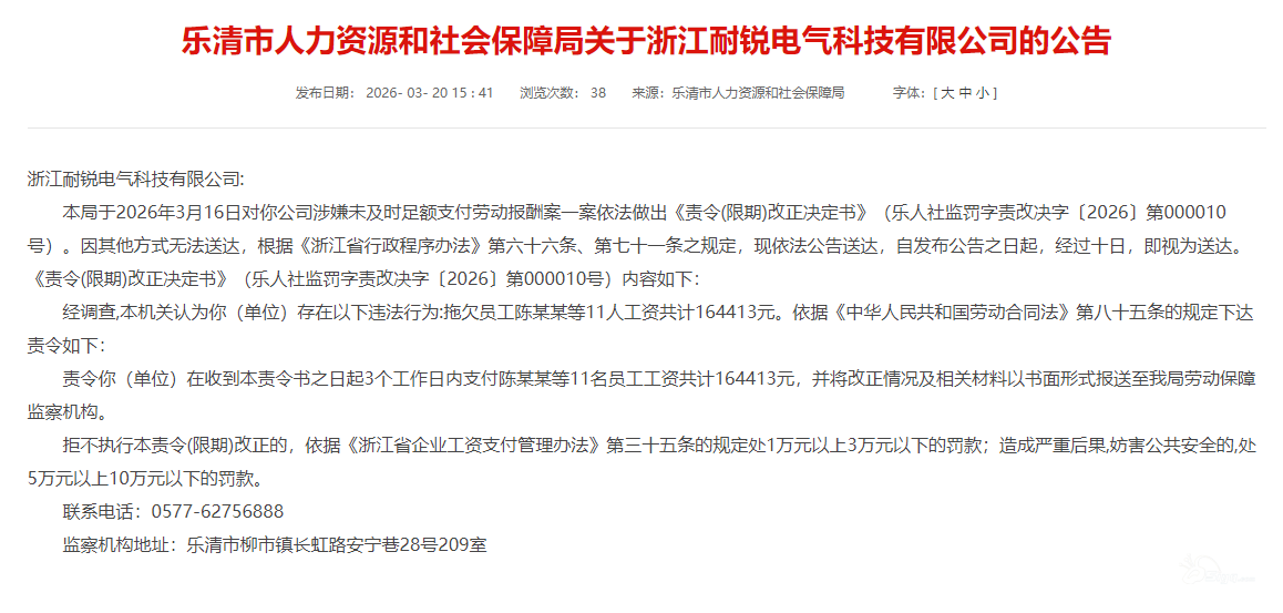 近日,乐清市人力资源和社会保障局发布公告,对浙江耐锐电气科技有限公司涉嫌未及时足额支付劳动报酬一案,依法作出《责令(限期)改正决定书》,并进行公告送达。 具体公告内容如下: 保障劳动者合法权益,是 ...